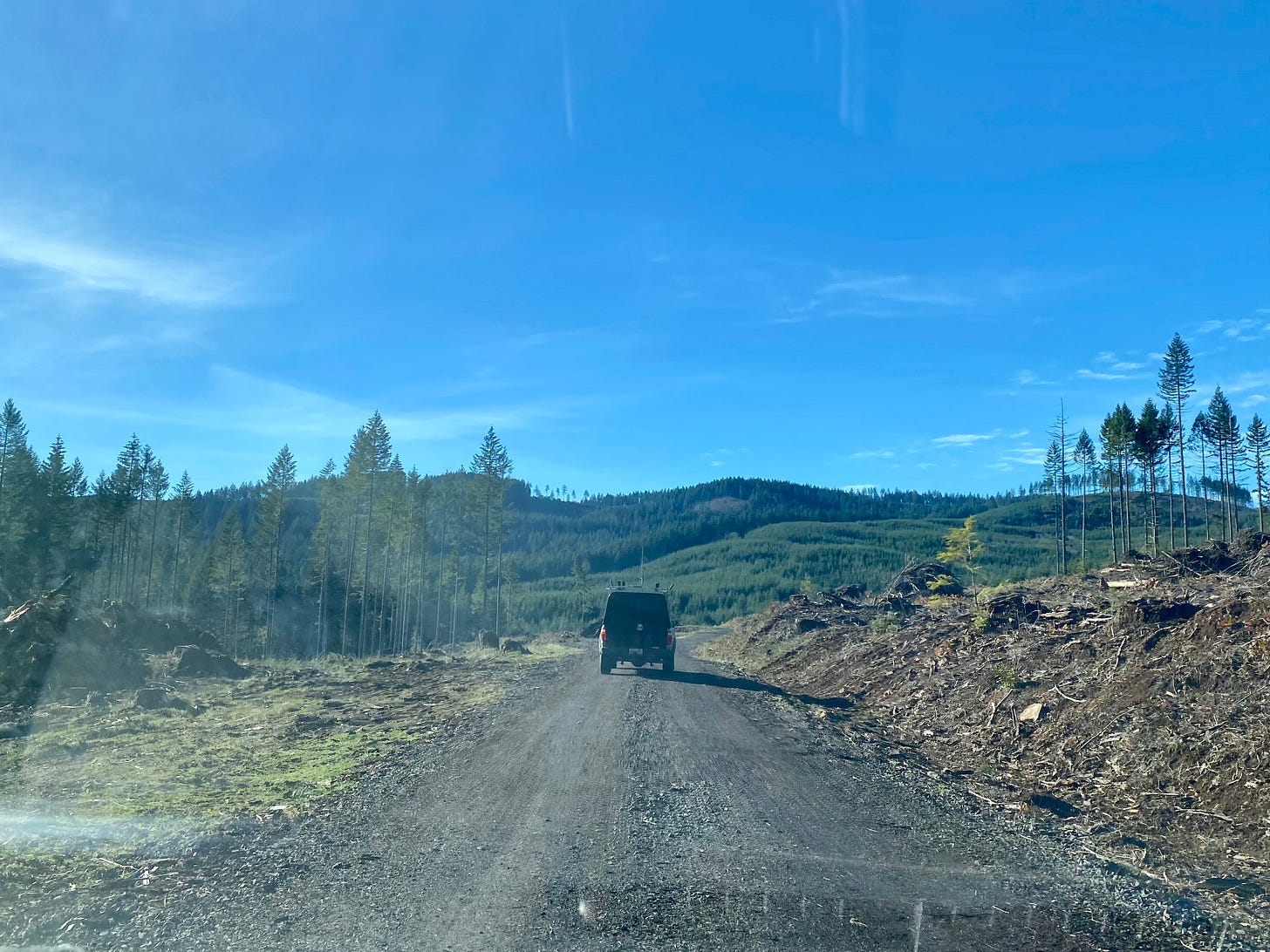 Mark told me to follow him up the road a few miles to the site we'd be working in. We drove through dense forest, full of mossy Dr. Seuss trees and bountiful sword ferns. Sometimes the canopy would close over the road like a tunnel. It was a bright blue day, nearly windless, dry and upper thirties, a blessed low-pressure rarity in January in Oregon. Conditions couldn't be better for climbing trees. I took a couple photos of the drive. Despite the momentous experience that would shortly follow, I didn't end up taking any more photos or videos, choosing to exclude the distractions a phone causes.